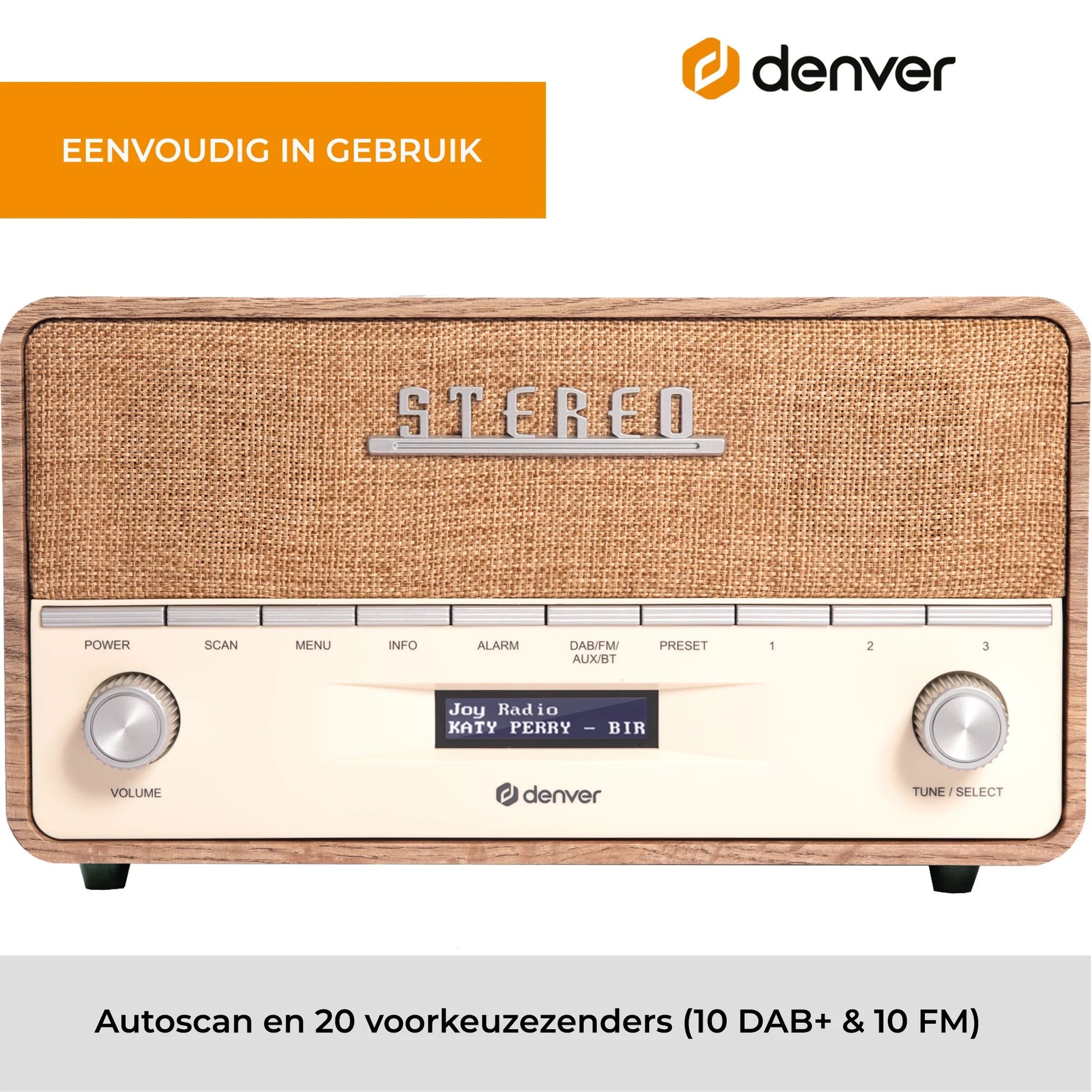 De Denver DAB36 is de grotere broer van de welbekende Denver DAB18 DAB radio! De DAB36 is een trendy retro radio met moderne afspeeltechnieken. Hiermee kun je favoriete radioprogramma's via stereo FM of DAB+ afluisteren en tevoren instellen. De digitale DAB+ tuner ontvangt signalen met een helder en ruisvrij resultaat. Daarnaast kun je draadloos via Bluetooth vanaf een smartphone of tablet je favoriete muziek beluisteren. Via de AUX ingang aan de achterkant kun je verder een MP3 speler aansluiten. Deze retro radio beschikt over 2 stereo speakers met een houten behuizing. De voorkant is uitgevoerd in zwart en grijs met de letters STEREO in retrostijl. Daaronder vind je 2 knoppen voor volume en programmakeuze en 10 toetsen, waaronder een aan/uitknop en een dubbel alarm met snooze functie. Ook is deze retro radio voorzien van 20 voorkeuzezenders! De dimbare LCD display op de voorkant geeft via een PPL tuner de naam en soort van het radioprogramma aan. Aan de achterkant vind je een antenne, AUX aansluiting en een kabelingang met AC aansluiting voor netstroom! Ook kan deze retro radio draadloos gebruikt worden d.m.v. batterijen!