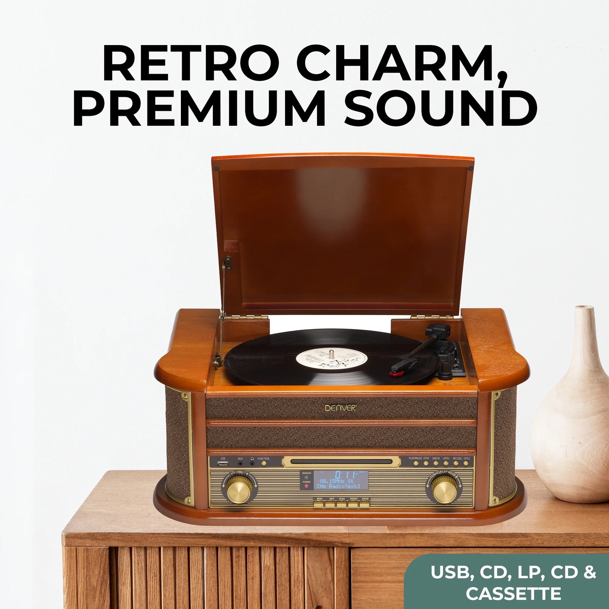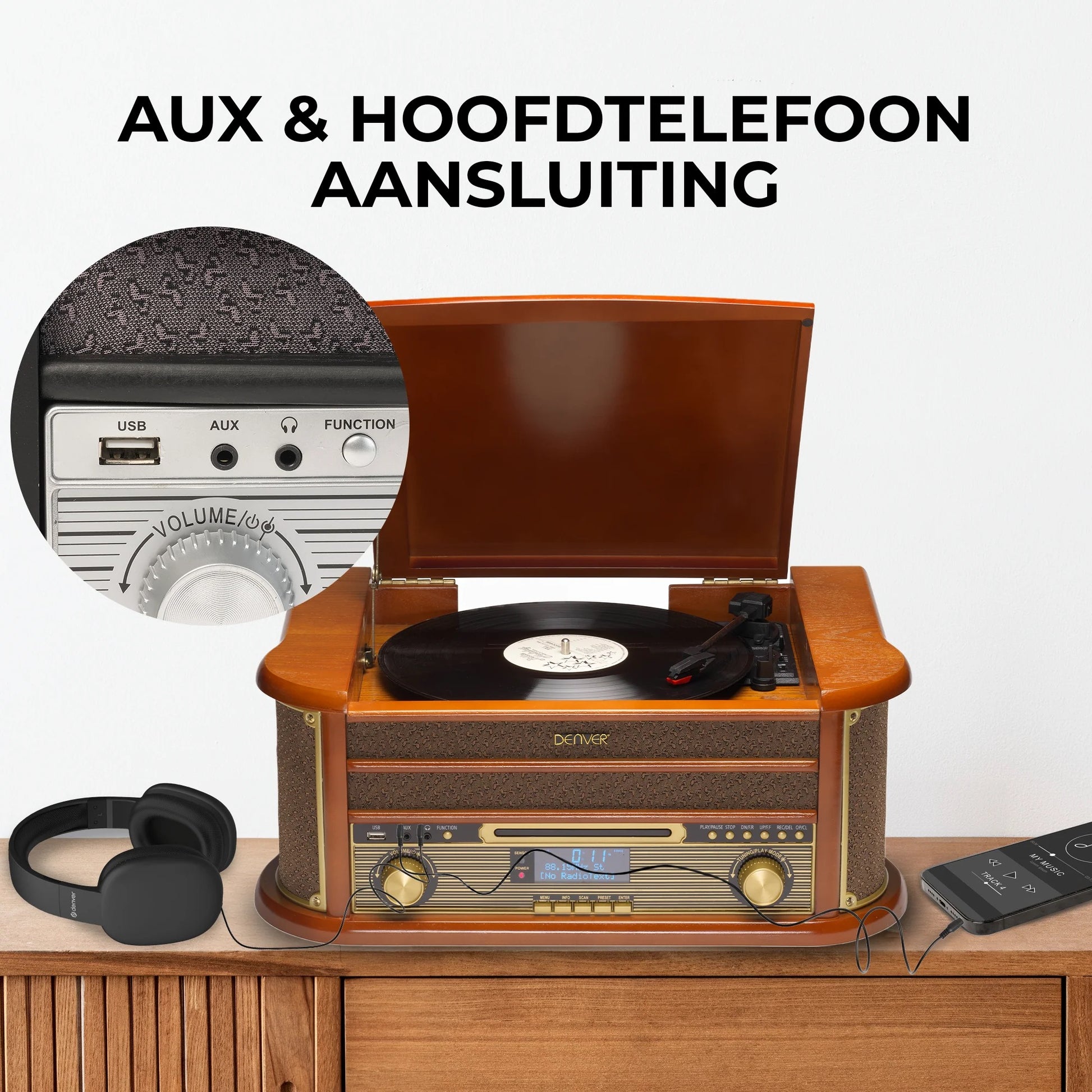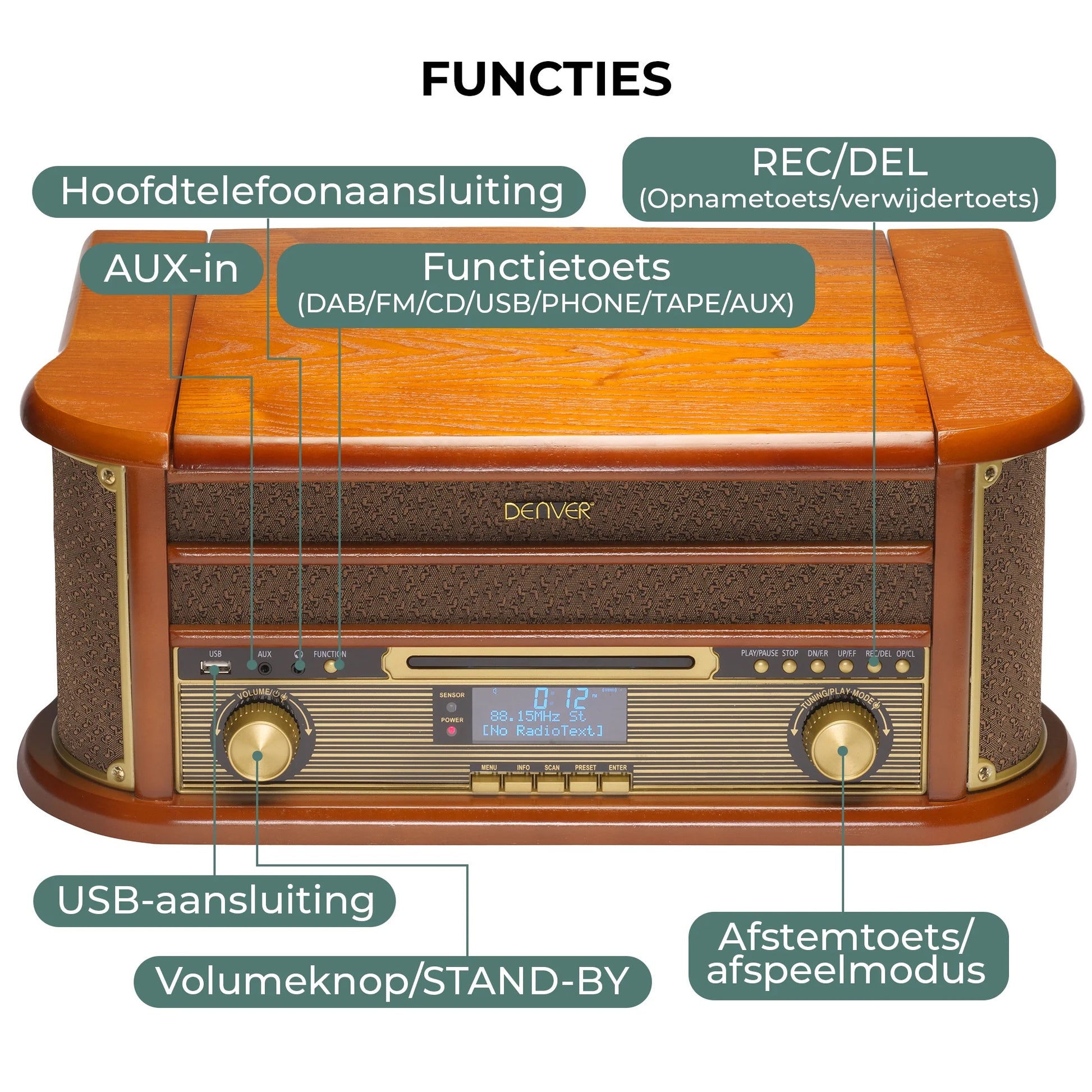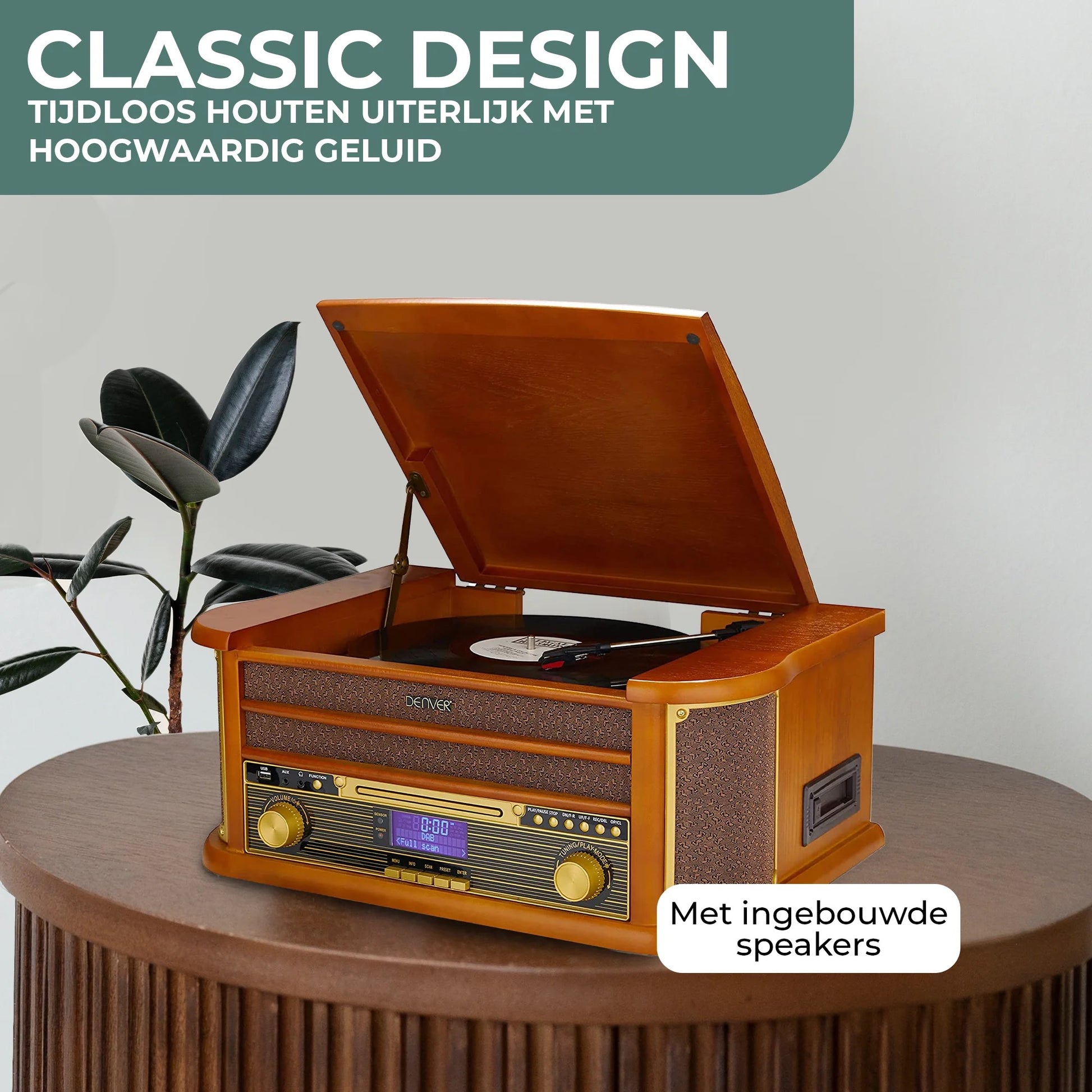 De Denver MRD51 retro Platenspeler is een echte blikkenvanger in elke woonkamer en is geïnspireerd op de platenspelers uit het begin van de vorige eeuw. De behuizing van deze platenspeler is van ECHT HOUT! Met dit retro music-center van Denver kun je o.a. vinyl platen, Cd’s, cassettes FM radio, DAB radio en MP3’s afspelen. Ook kun je met deze retro platenspeler gemakkelijk vinyl, Cd én cassettes digitaliseren naar MP3 via de USB-ingang. Dit is zeer eenvoudig te doen via de 'RECORD' en 'STOP' knop! Bovendien is de MRD51 voorzien van een ingebouwde versterker en wordt daarnaast geleverd inclusief afstandsbediening! Geen eigen muziek voor handen? Geen probleem deze vernieuwde uitvoering beschikt ook over een DAB+ radio. Hiermee luistert u storings- en ruisvrij naar uw favoriete radiozender!