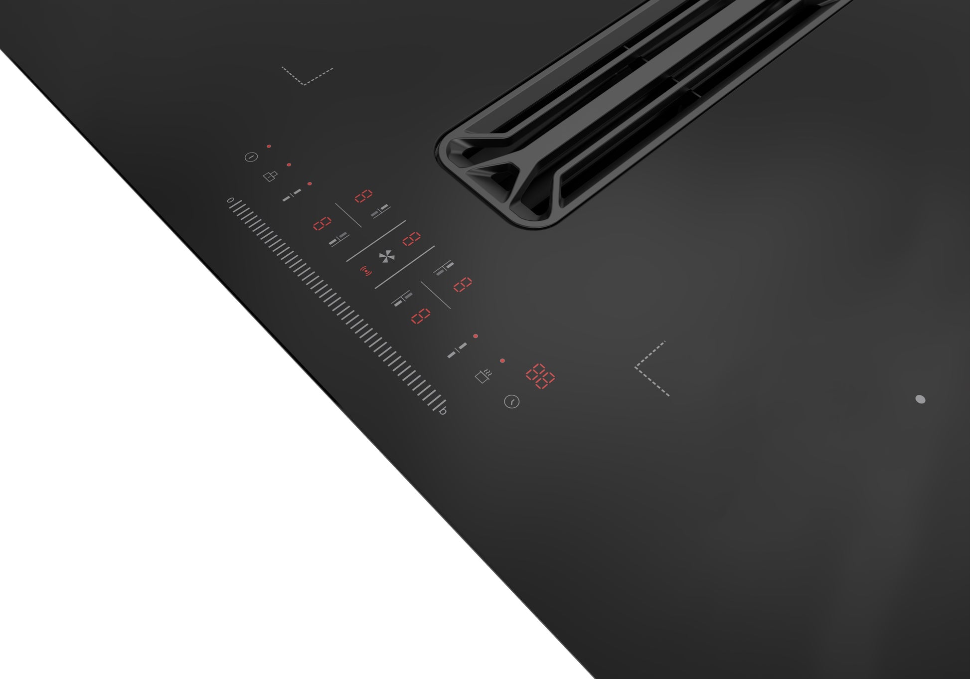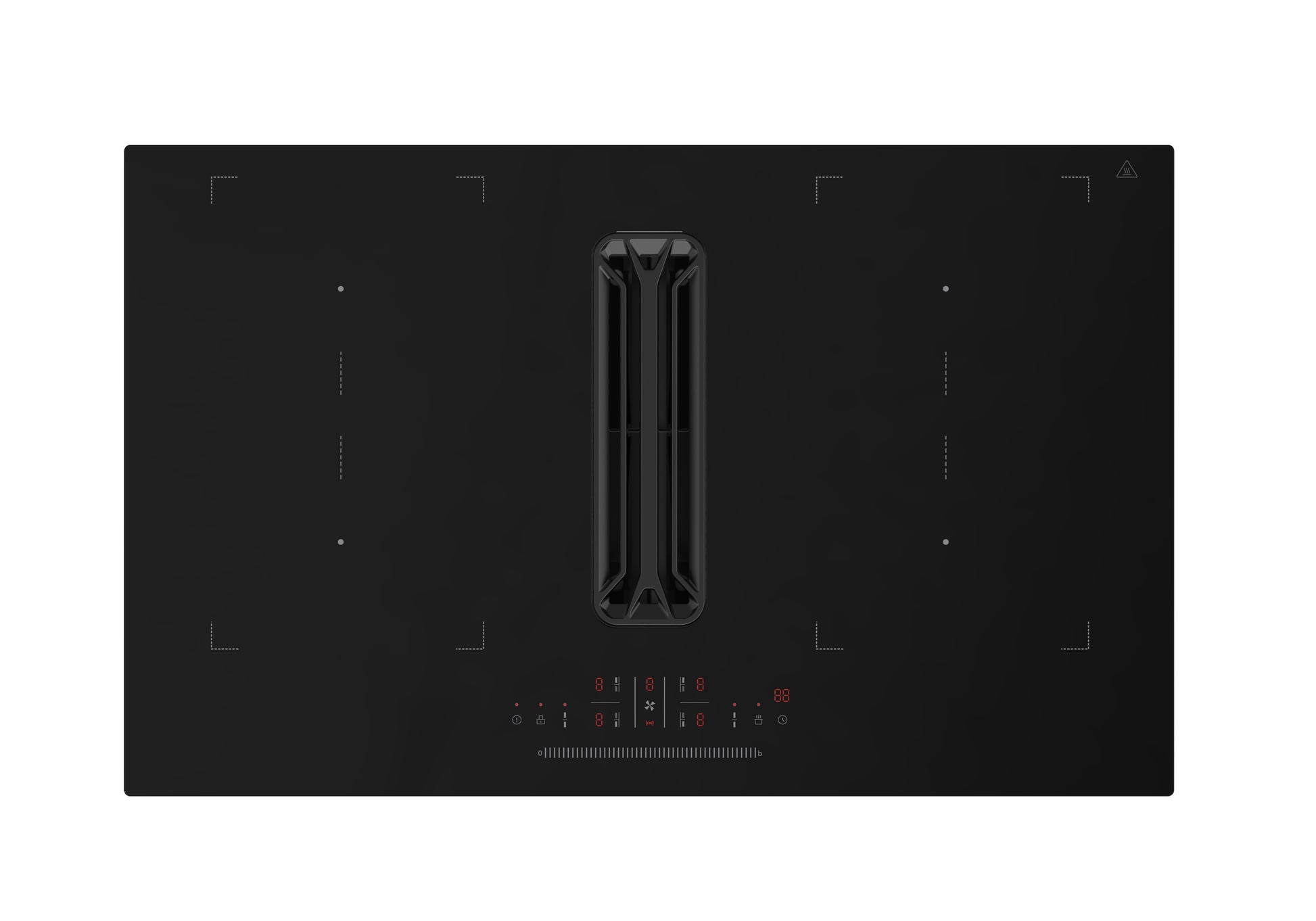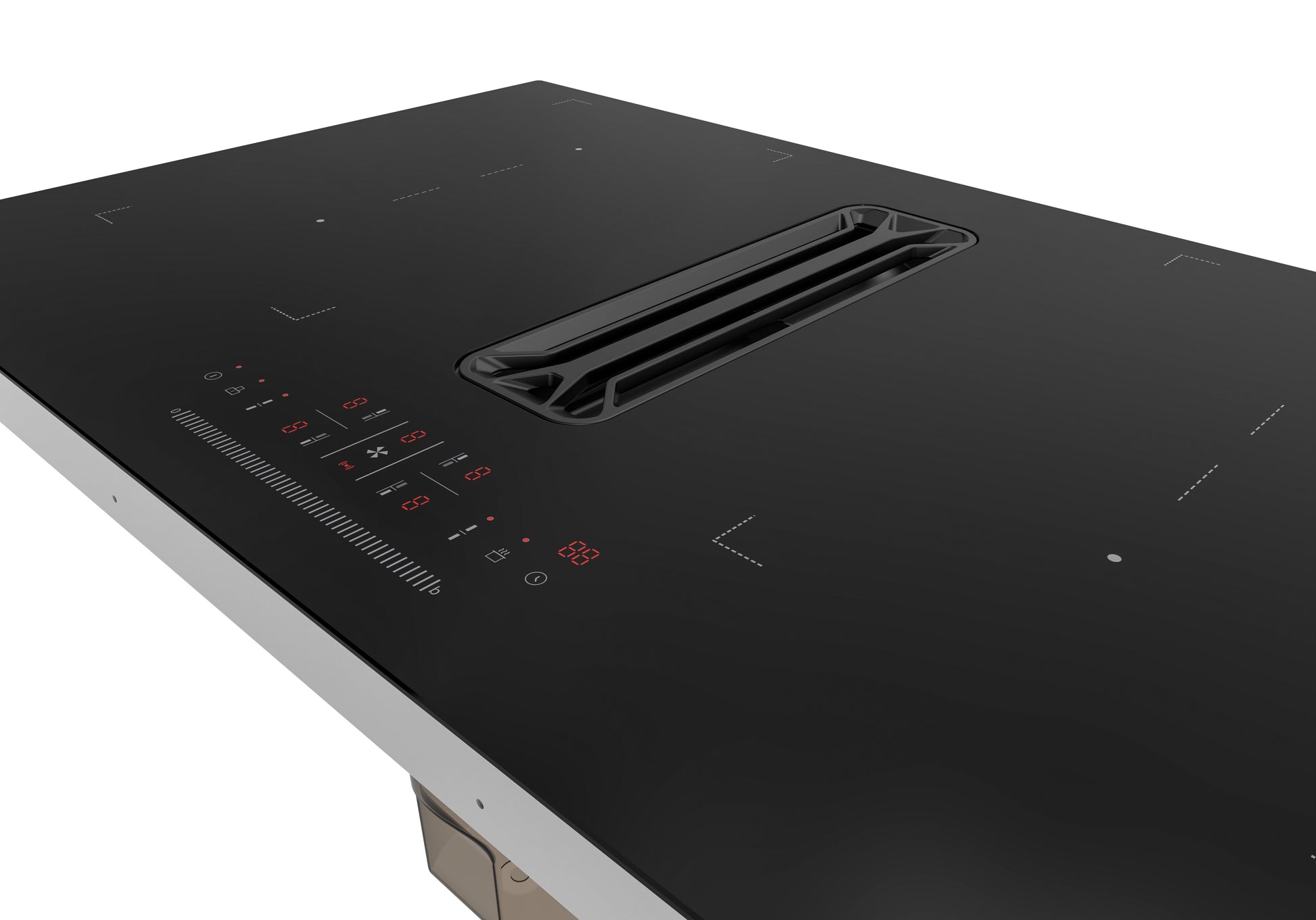 Uniek aan deze kookplaat is de geïntegreerde afzuiging tussen de kookzones. Deze afzuiging heeft een sterke capaciteit van 544 m³/uur, waardoor kookdampen en geuren direct worden afgezogen. Ondanks zijn kracht blijft het geluidsniveau met maximaal 67 dB(A) bijzonder laag, wat zorgt voor een rustige kookomgeving.