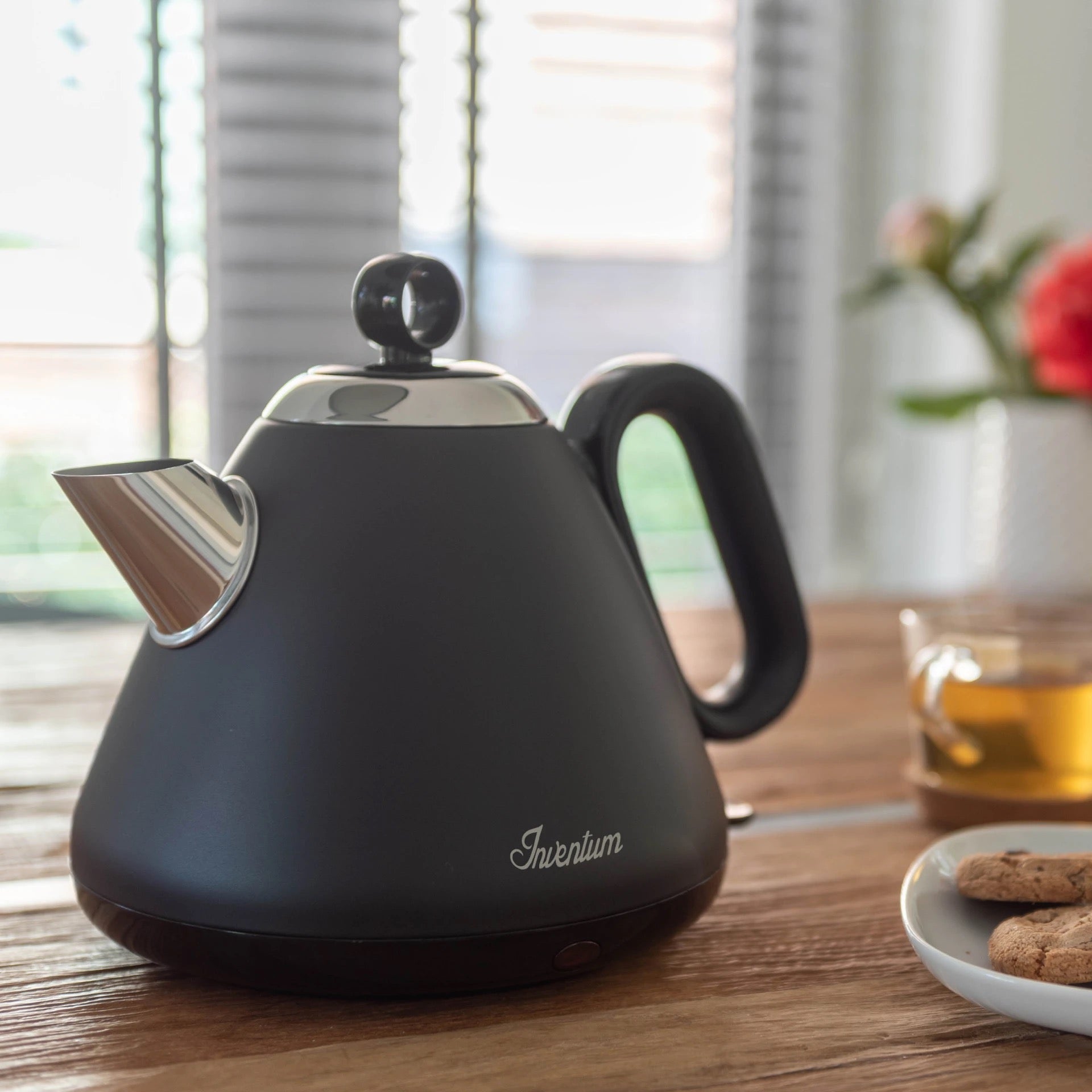 De zwarte Inventum retro waterkoker HW617B heeft een inhoud van 1,7 liter. Door het hoge vermogen van 2200 watt kookt het water snel. De waterkoker is voorzien van een uitneembaar anti-kalkfilter, automatische uitschakeling en een droogkookbeveiliging. Je kunt de waterkoker snoerloos bijvullen of uitschenken.