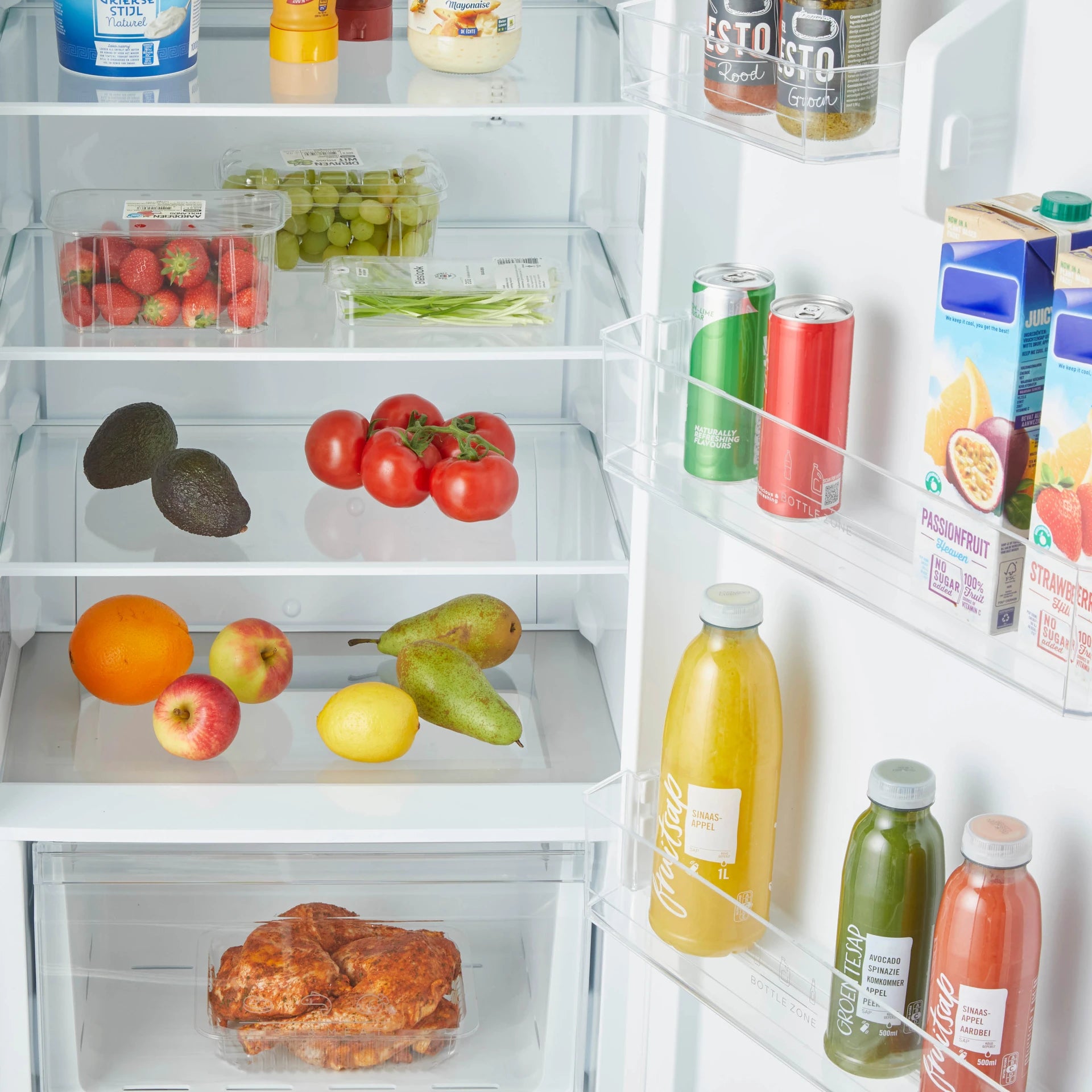 De zuinige vrijstaande koeler KK1850W van Inventum heeft energieklasse C en een geluidsniveau van 38 dB. Het is een hoog model met een inhoud van 362 liter. Het apparaat heeft superkoelen, 5 glazen draagplateaus, 2 groentelades, 5 deurvakken en led-verlichting. In de deur is de digitale regelbare thermostaat verwerkt. Daardoor kun je altijd zien wat de temperatuur in de koeler is en het makkelijk aanpassen. Het apparaat is ook uitgerust met een handig alarm dat je waarschuwt als je de deur open laat staan. De draairichting van de deur kan worden aangepast.