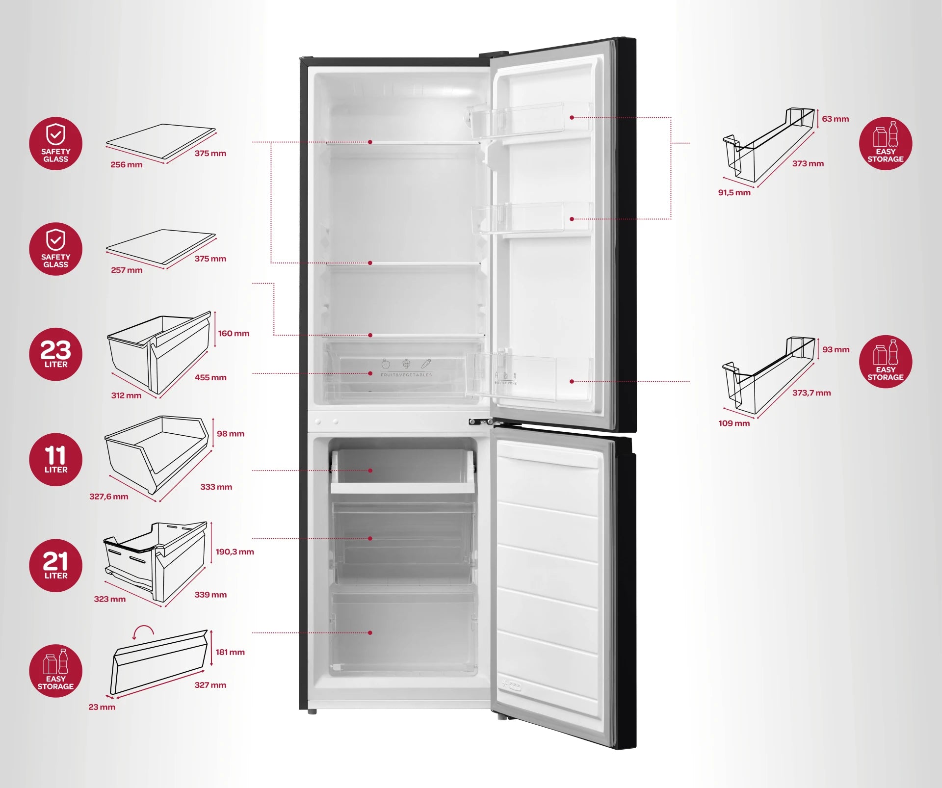 De Inventum vrijstaande koel- vriescombinatie KV1500B heeft een totale netto inhoud van 174 liter. Het is een koel- vriescombinatie met energieklasse D. Het koelgedeelte is bovenin, het vriesgedeelte onderin. Het ruime koelgedeelte met superkoelen en een flexibele indeling is voorzien van energiezuinige led-verlichting. Het 4 sterren, Low Frost vriesgedeelte met supervriezen heeft 1 transparante lade, 1 open lade, 1 vak met klep en een netto inhoud van 59 liter. Het invriesvermogen is 2,7 kg/24u. In deze koel- vriescombinatie is genoeg ruimte om al je etenswaren netjes op te bergen. Deze onderdelen zijn eenvoudig te verwijderen, zodat je ze goed kunt schoonmaken.