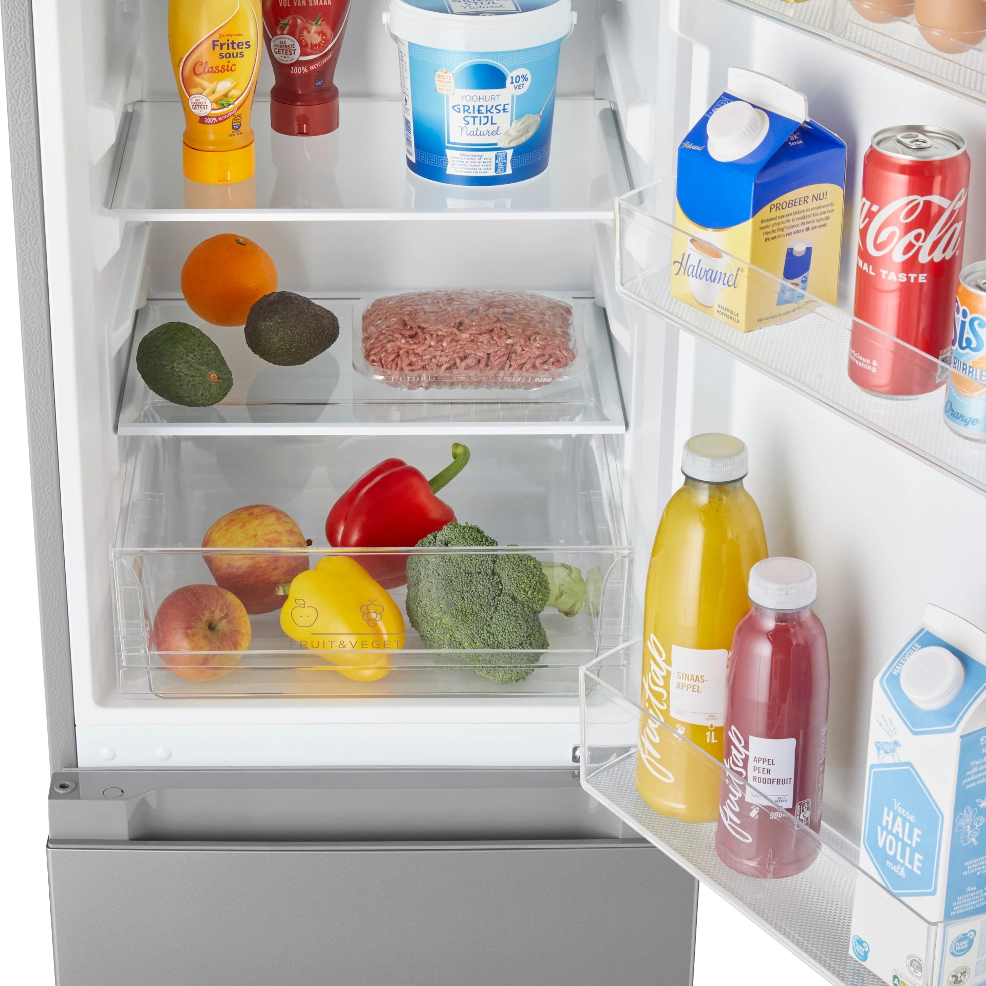 De Inventum vrijstaande koel- vriescombinatie KV1500S heeft een totale netto inhoud van 174 liter. Het is een koel- vriescombinatie met energieklasse D. Het koelgedeelte is bovenin, het vriesgedeelte onderin. Het ruime koelgedeelte met superkoelen en een flexibele indeling is voorzien van energiezuinige led-verlichting. Het 4 sterren, Low Frost vriesgedeelte met supervriezen heeft 1 transparante lade, 1 open lade, 1 vak met klep en een netto inhoud van 59 liter. Het invriesvermogen is 2,7 kg/24u. In deze koel- vriescombinatie is genoeg ruimte om al je etenswaren netjes op te bergen. Deze onderdelen zijn eenvoudig te verwijderen, zodat je ze goed kunt schoonmaken.