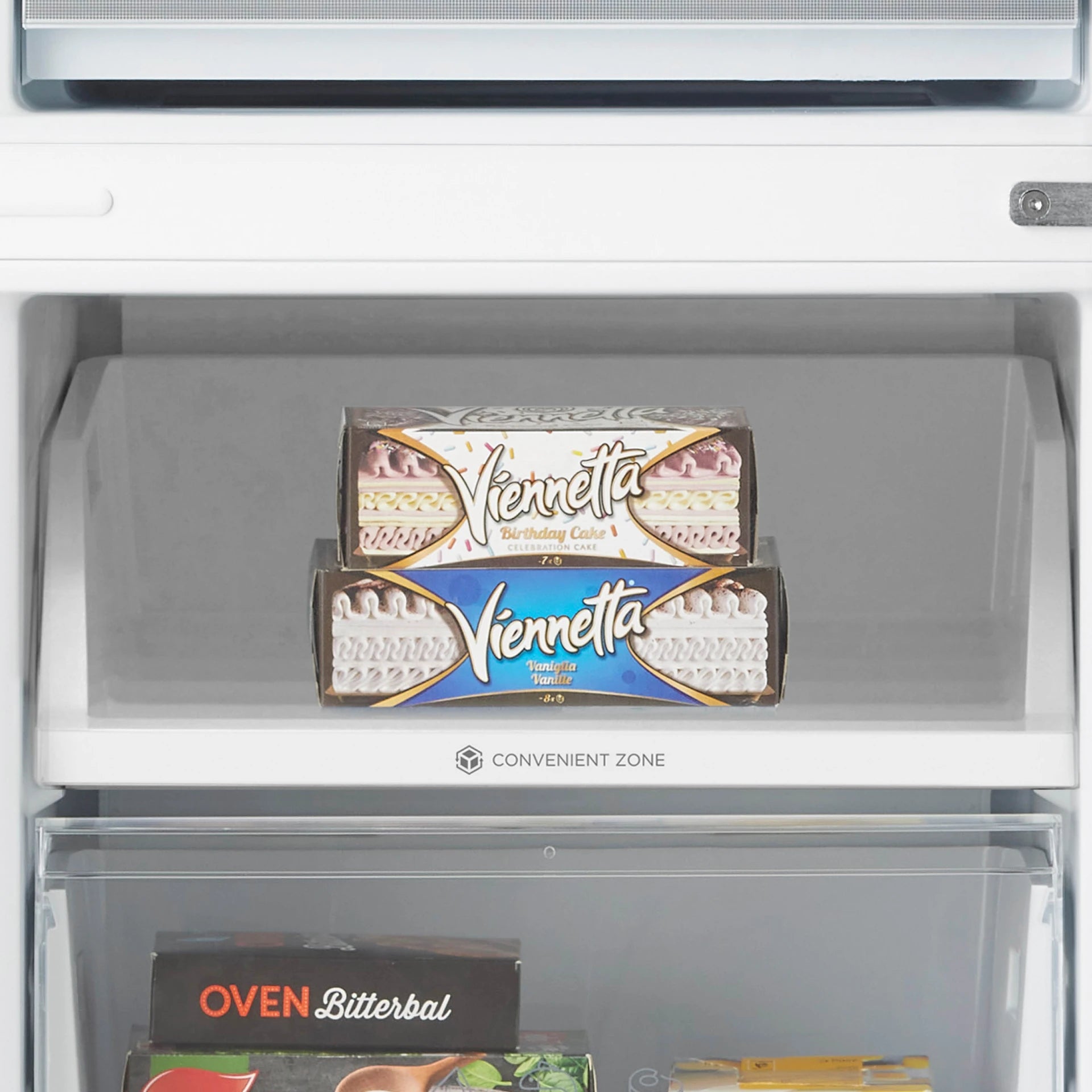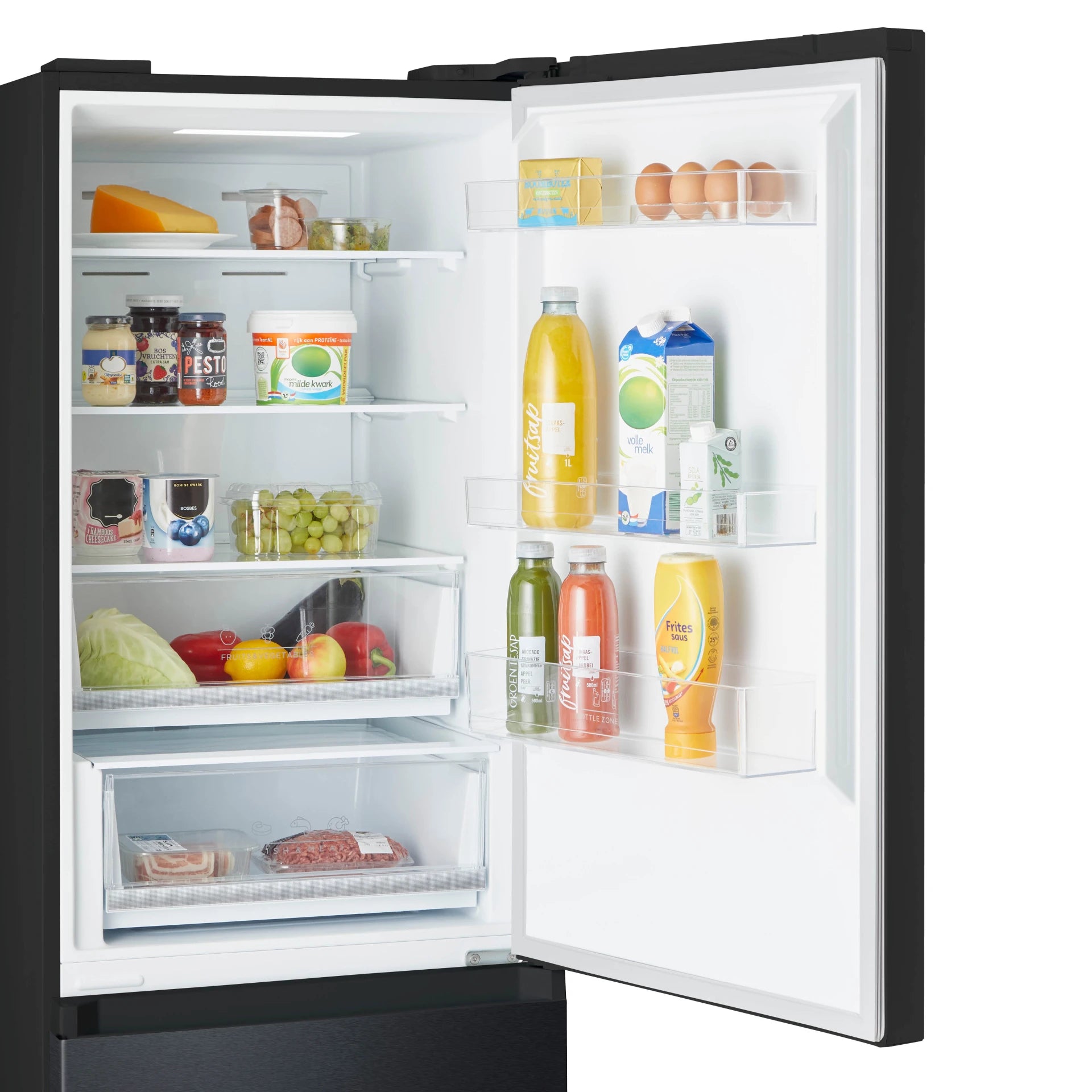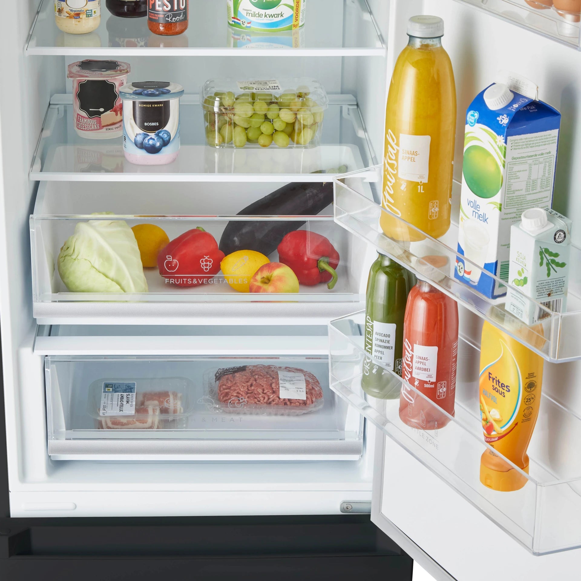 De zuinige en zeer stille vrijstaande koel- vriescombinatie KV1850B van Inventum heeft energieklasse C en een geluidsniveau van maar 35 dB. Het is een hoog model met een netto inhoud van 338 liter. Het koelgedeelte van 216 liter heeft een superkoelen-functie, 3 glazen draagplateaus, 1 variabele vershoudlade, 1 gewone groentelade, 3 deurvakken en led-verlichting. In de deur is de digitale regelbare thermostaat verwerkt. De 4 sterren vriezer van 122 liter heeft supervriezen, No Frost, 2 transparante lades en 1 open lade. Je kunt in 24 uur tot 8,5kg aan etenswaren invriezen en valt de stroom een keer uit, dan blijven je etenswaren 12 uur lang bevroren. Het apparaat is ook uitgerust met een handig alarm dat je waarschuwt als je de deur open laat staan. De draairichting van de deur kan worden aangepast.