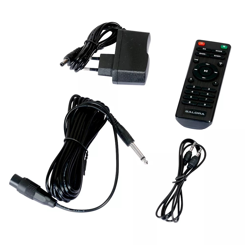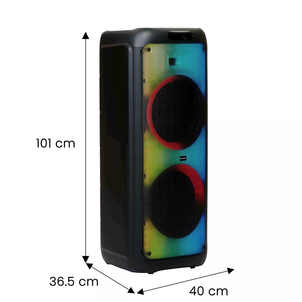 Creëer jouw feestje met de Salora PartySpeaker XXL1. Deze Bluetooth party speaker beschikt over 2x 12’’ speakers met een vermogen van 1200 watt. Met de 8000 mah accu is deze speaker ook draadloos te gebruiken en heb je ruim 5 uur luister plezier. Je kan gebruik maken van 2 microfoon ingangen en